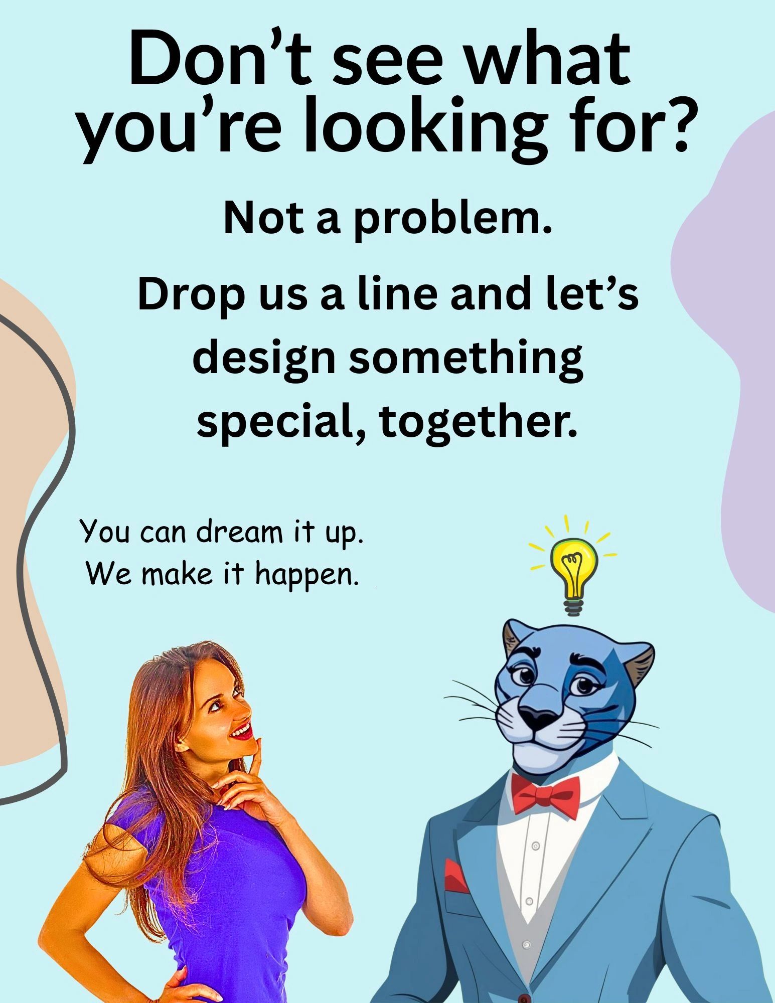 At The Blue Panther Party, we pride ourselves on our ability to accommodate any reasonable request. So, tell us about your ideas and let us get to work on it.