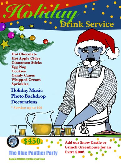 We serve up to 100 guests with our signature Holiday Drink Service. Hot Chocolate, Hot Apple Cider and Egg Nog